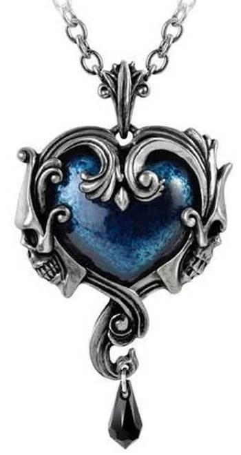 A large pewter heart pendant, the centre piece enamelled in a transparent midnight blue and surrounded by an antiqued pewter Baroque frame with a skull profile on either side. There is a black Swarovski crystal teardrop suspended below and the pendant hangs from a pewter bale on a 32″ (82cm) long trace chain.