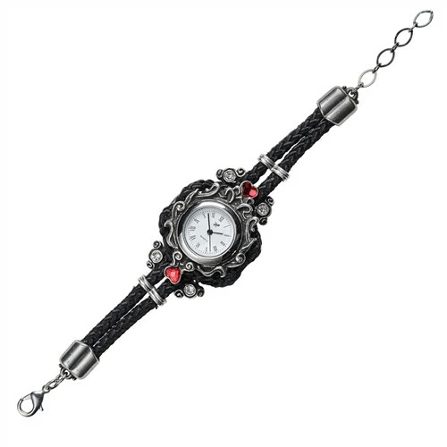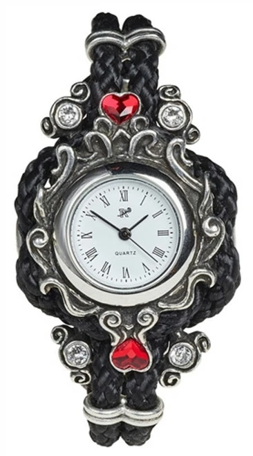 An elaborate and delicate looking wrist watch with a black braid synthetic strap, interwoven with the polished pewter scroll-work frame which is studded with four clear and two red heart Swarovski crystals. The watch face is ¾” (20mm) diameter, and the strap ends are also pewter with a spring catch and short extender chain fastener that allows from 18cm to 21cm circumference.