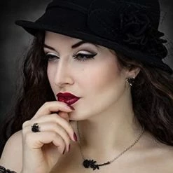 A polished pewter ring of a stylised ram’s skull with clear Swarovski crystals, floriate Baroque horns and set upon a split shank