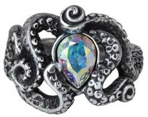 by Alchemy, a highly detailed kraken/squid tentacled ring set with a Swarovski crystal heart in a white rainbow effect.