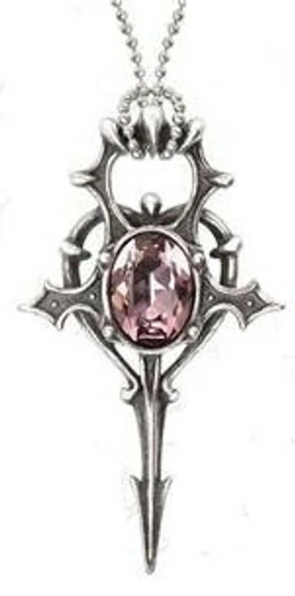 This Alchemy pendant is a gothsised symbol of eternal life, the ankh, melded subtly with the background heart and prominently surmounted by a sumptuous amethystine gem; with Swarovski crystal.