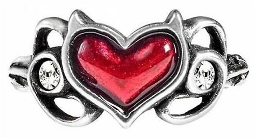 Little Devil Ring by Alchemy is a delicate pewter ring of a blood-red enamelled Devil’s heart flanked by two Swarovski white crystals.