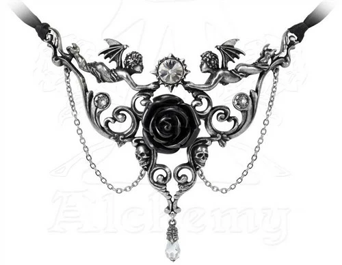 A large, elaborate symmetrical pewter necklace of Baroque scrolls set with three clear Swarovski crystals and a large, black resin rose at its centre above two small skulls, hung with draped trace chain and surmounted by two bat-winged cherubs; on a 7mm wide black satin ribbon fastened with an adjustable pewter slide, allowing a choker fitting or up to 34″ (86cm) long overall.