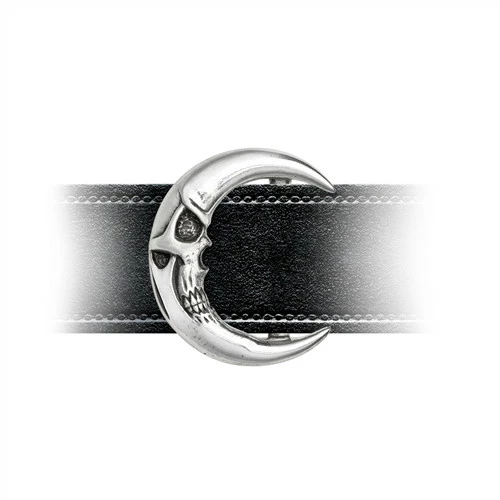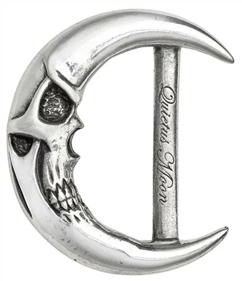 A classic D-shaped, crescent moon themed, polished pewter belt buckle in the form of a grinning skull; for a 38mm / 1½” wide strap