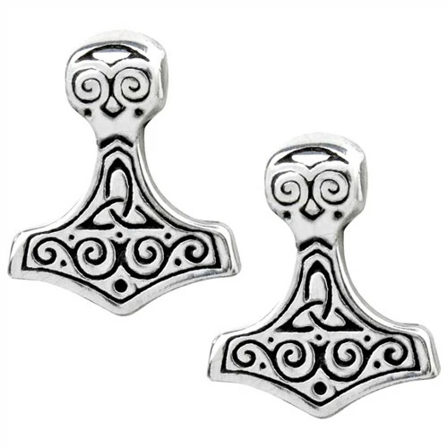 A pair of pewter ear studs of Thor’s hammers engraved in traditional Viking style; with surgical steel ear-posts.
