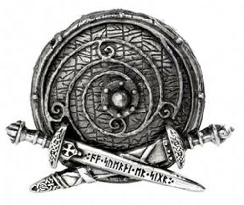 The rune-cut battle shield and trusted sword of a Viking leader.