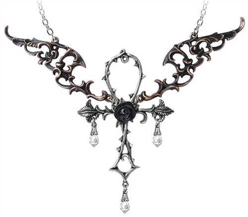 Combining the spirituality of Ancient Egypt and the elegant artistry of the European Renaissance begets the symbol of everlasting life and love, a black rose ankh taking flight upon delicate Baroque-laced wings.