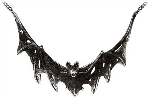 A faded dark pewter necklace of a ragged, spreadeagled, swooping bat.