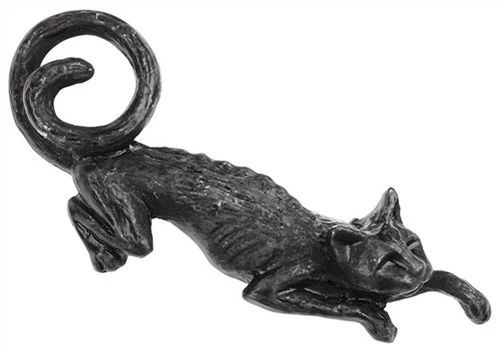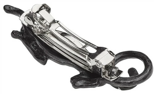 Alchemy’s Fairy Cat Sith Hairslide / Grip is 50mm long black pewter cat in stalking position, fully 3D modelled, with a 25mm (1″) spring steel grip beneath.