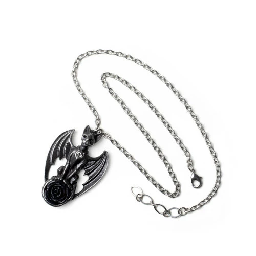 Alchemy Guardian of Soma Pendant is a statuesque winged black cat inlaid with a black diamond Austrian crystal and large acrylic black rose. Handmade with care in blackened pewter with hand polished highlights that shimmer in the light.
