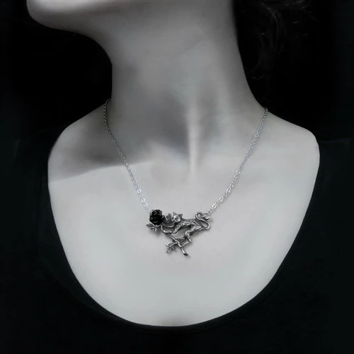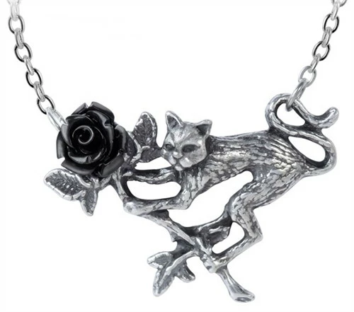 A small pewter necklace of a dark cat coveting a single black rose, with a black resin flower and on a split chain 49 cm overall