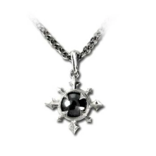 A shimmering, metallic hematite cabochon forms the nucleus of this mystery-shrouded symbol of anti-order; the eight arrows of chaos. Drop 4.5 cm long.