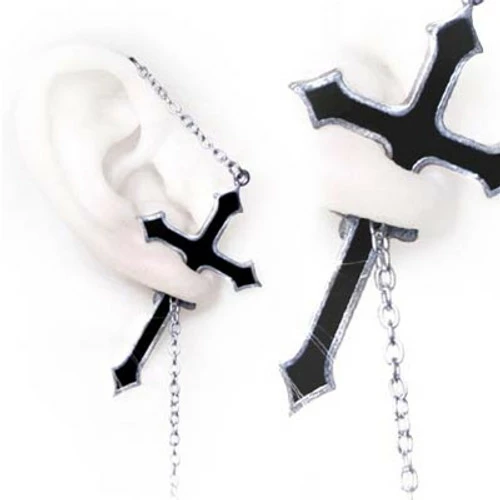 Pierced by the enduring symbol of sacrifice; black-enamelled cross piercing the earlobe. With surgical steel post.