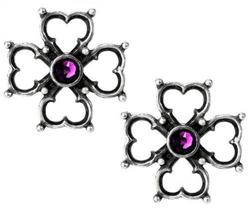 These Alchemy Earrings are from Robert Dudley, Earl of Leicester’s original motif for the decorative moulding above the north entrance to the 16th century Kenilworth Castle, in honour of his great secret love, Elizabeth Rex, alas, censored and never used … Set with Swarovski crystal centres. A pair of openwork cross-shaped pewter ear-studs, formed by heart shaped trefoils, and with a Swarovski crystal at their centre; with surgical steel ear-posts