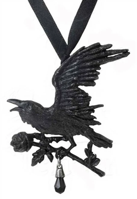 A black pewter profile pendant of a flying raven with a rose in its claws, suspending a black Swarovski crystal dropper with burnished pewter cap. On 38″, (96cm) long, 7mm black ribbon necklace, to be hand tied.