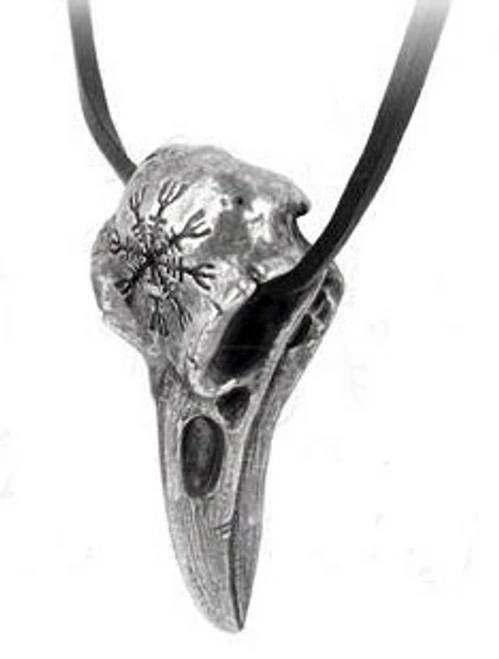 This raven’s skull has been engraved upon its head with the Icelandic stave symbol, ‘Aegishjalmur’. on black leather thong.