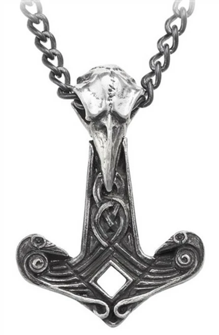 Alchemy Raven Hammer Pendant featuring the combined magic of Odin’s steadfast servants, Huginn and Muninn, his raven intelligence-bringers, and Thor’s thunderous mountain-crushing hammer, Mjolnir, are sure to bestow great powers of strength and protection upon the amulet’s custodian.
