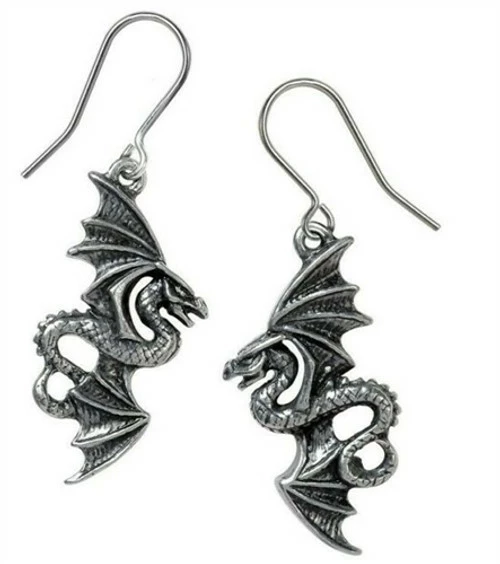 Alchemy Flight of Airus Droppers are a miniature pair of double sided antiqued pewter earrings of a flying dragon with outstretched wings. On surgical steel ear-wires.