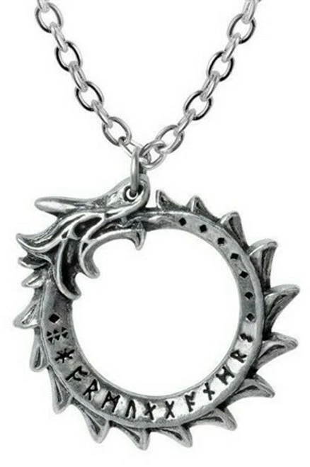 Alchemy Mini Jormungand Pendant is a 27mm antiqued pewter ring pendant in the form of a dragon-snake. On a fine 46cm trace chain.
