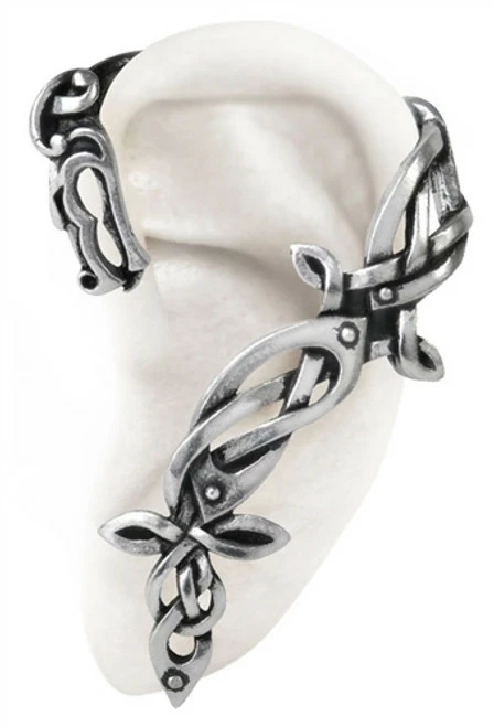 A polished pewter Celtic style knotwork dragon wrapping around the ear, the head appearing from behind the top of the ear. Can be gently bent to comfortably fit your own ear; fastened with one surgical steel ear-post.