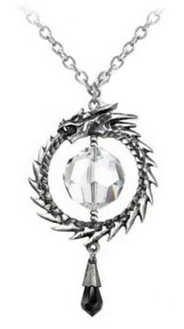 The ouroboros or gnostic world disk, the great work of the goddess of wisdom – the eternity of the soul; with large, rotating Swarovski crystal globe & jet dropper.