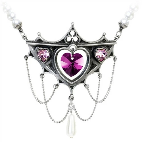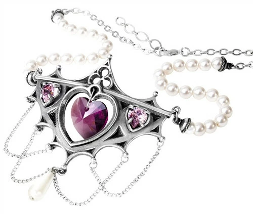 From Robert Dudley, Earl of Leicester’s original motif for the decorative moulding above the north entrance to the 16th century Kenilworth Castle, in honour of his great secret love, Elizabeth Rex, alas, censored and never used … Set with three Swarovski crystal hearts and an Elizabethan pearl dropper