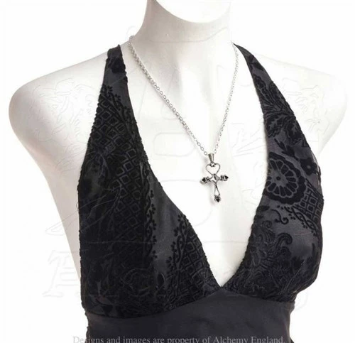 A small, lightweight, pewter ankh pendant made of scrollwork heart motifs, ending in three small black enamelled hearts on each arm and a Swarovski black diamond, starlet-shaped crystal at its centre.