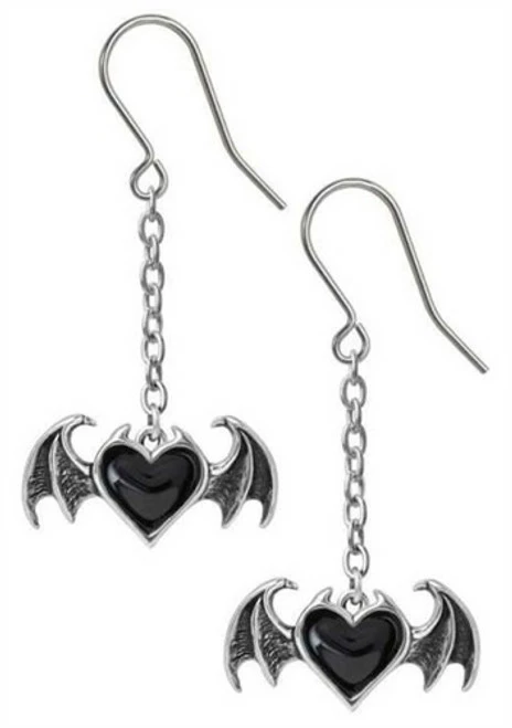 A miniature left and right pair of antiqued pewter black-enamelled heart ear-studs with bat wings.