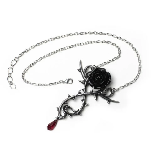 Alchemy Carpathian Rose Pendant is a Twisted pewter rose vine encapsulating a jet black rose. The most beautiful blood red, Austrian crystal dropper appears as if a thorn has pierced the skin.