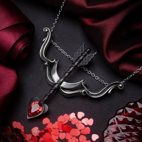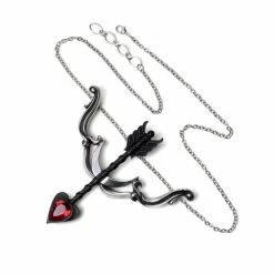 Alchemy Desire Moi Necklace is a elegant but striking cupids bow and arrow necklace. A hand polished baroque bow with crescent moon detail and contrasting black pewter arrow. A heart shaped arrowhead is inlaid with the most beautiful of Austrian crystals, a red Siam tear drop.