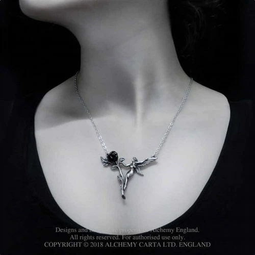 An intricate pewter pendant of a fairy capering around a single black rose, with a resin flower and on a 18″ (23 cm) long chain.