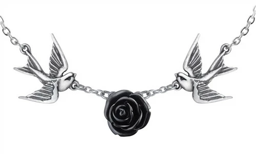 An articulated pewter necklace of a pair of traditional tattoo style swallows, with a resin black rose flower suspended between them, and on a split chain 51 cm overall.