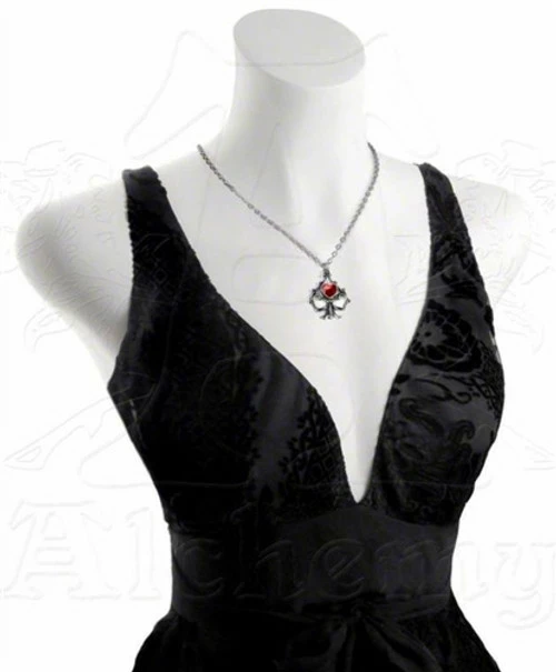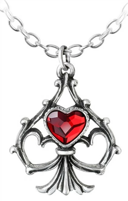 Pewter filigree pendant of an ornamental ace of spades symbol, superimposed with a Swarovski, red crystal heart.