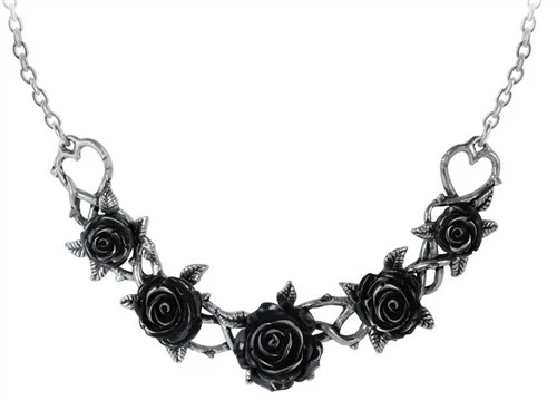 Rose Briar Necklace by Alchemy, a single-piece cast pewter crescent of rose stems and leaves set with five resin, black rose flower heads.