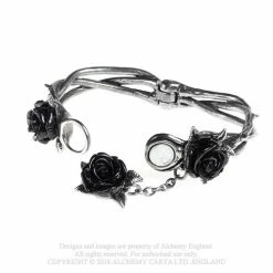 A hinged pewter, twisted rose thorn bracelet featuring three black resin roses upon the front. The central rose, (attached to a short safety chain), forms the locking device with a strong magnet; simply unfasten by pulling the centre rose out from its magnetic lock.