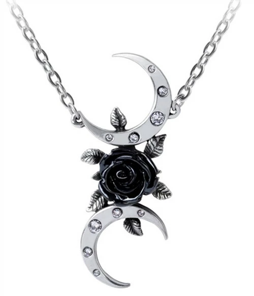 An alternative allegory for the Triple Moon Goddess, seen from a romantically oblique perspective, with a black rose ‘moon’ and tangential, crystal studded crescents to celebrate the mysticism of Wicca.