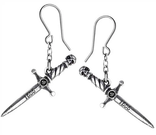 A pair of small, antique pewter daggers with a small, black cabochon on each hilt and engraved blades; on surgical steel ear-wires.