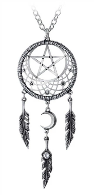 This traditional style dream snare has a pentagram woven into its fine web and supports a sacred crescent moon, deflecting evil influences, misfortune and physical harm, averting the evil eye from wanton malefactors. Compliment any outfit and Catch your dreams or nightmares with this stunning pendant.