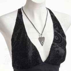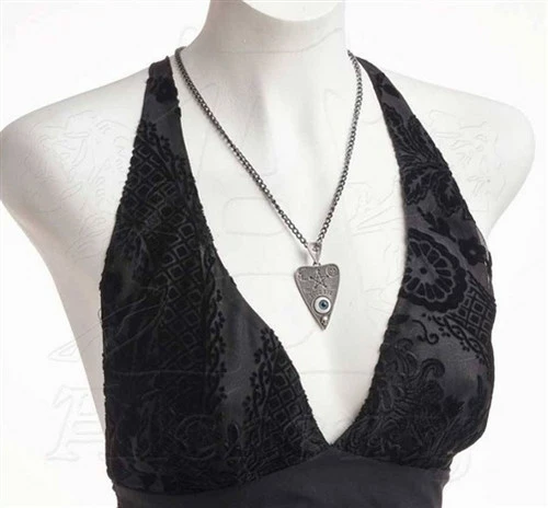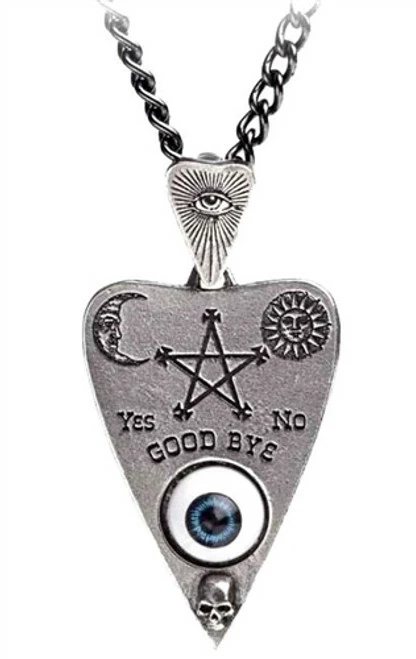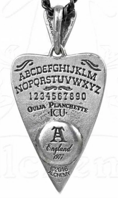 A pewter pendant shaped as a seance planchette, or ouija pointer, engraved with mystical symbols, plus the alphabet on the reverse, and with a realistic acrylic eye set into the recess.