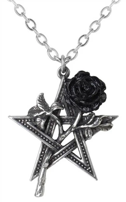 A detailed pewter pentagram entwined with a black petalled rose