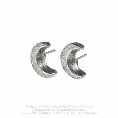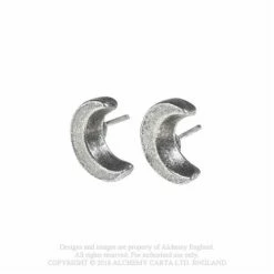 A pair of small, simple pewter ear-studs in the form of a crescent moon, on surgical steel stud ear-posts