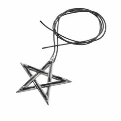 An over-sized, polished pewter interwoven pentagram, overlayed with embedded black waxed cord which is extended to become the hanging cord; 72cm overall, for hand tying.