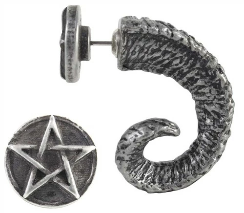 A pewter fake stretcher stud piercing, in the form of an antiqued, gnarled and twisted ram’s horn. The end cap, with a standard surgical steel post, is in the form of a pentagram disc
