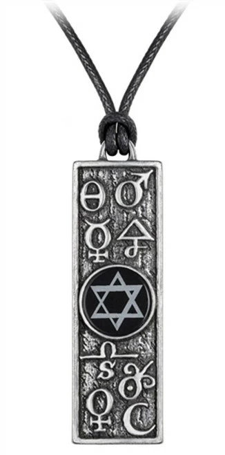 A talismanic magic tablet device for assisting in the achievement of the the alchemist’s magnum opus, the ‘great work’, incorporating sigils of the principle constituents required for alchemical transmutation; sun, moon, spirit, salt, sulphur and mercury, and a Solomon’s Seal formed by the unity of the four elements engraved upon its natural black onyx focal disc.