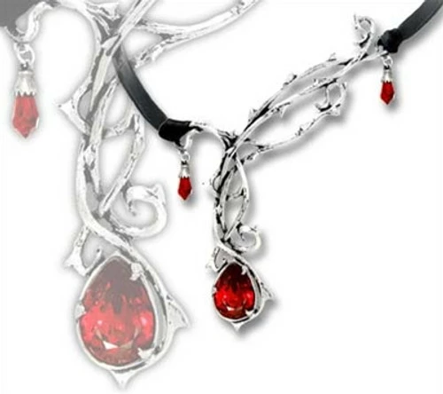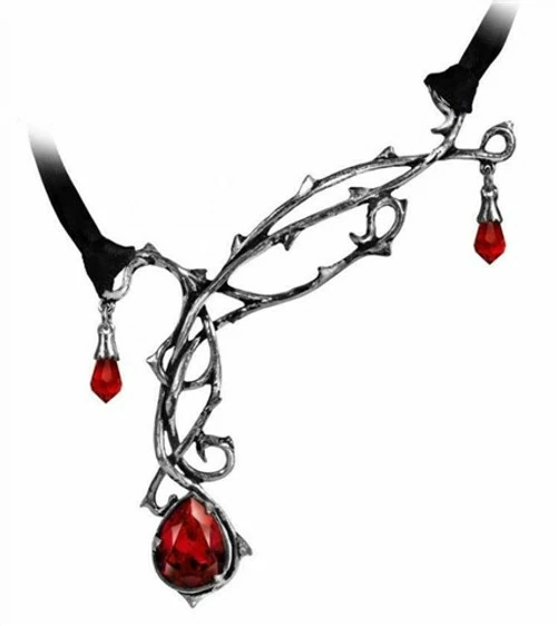 Polished pewter asymmetrical thorny bramble necklace. Finished with crystal blood drops and a Swarovski cut crystal blood gem.