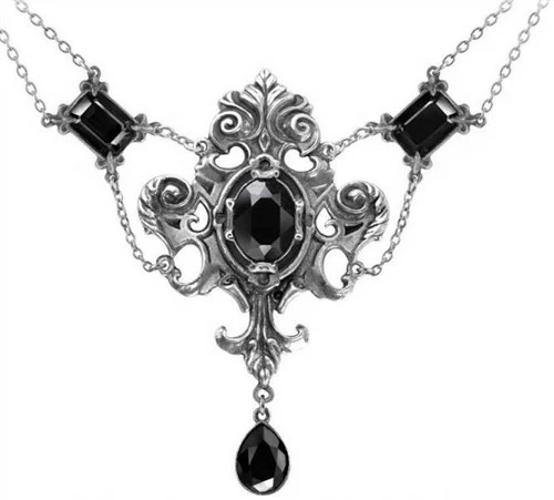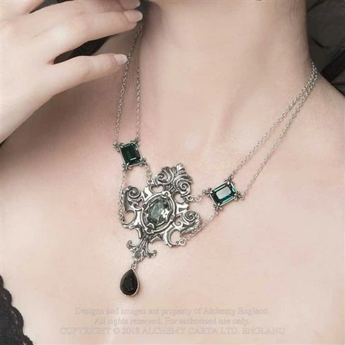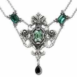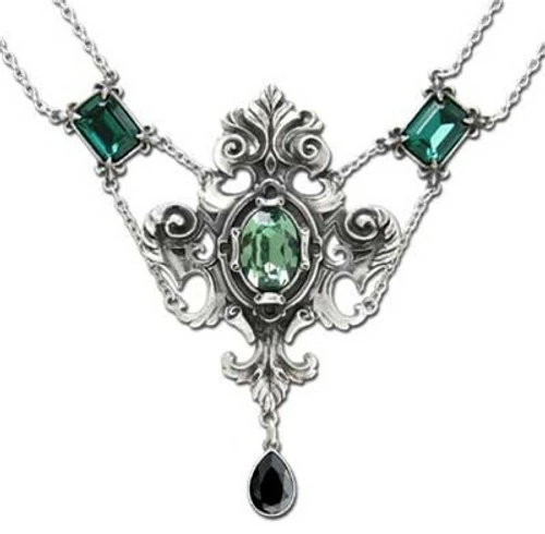 A pewter baroque-styled sculpted cartouche, flanked by matching stone-sets and finished with a crystal dropper. All set with green and black cut Swarovski crystals.