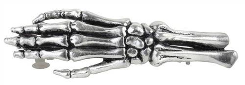 Pewter hair ornament of a human skeletal hand, upon a sprung steel hair clip.