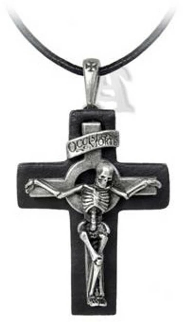 The suffering corpse is labelled with the Latin for ‘Killed By Death’; suspended on a cut-out, black leather cross.