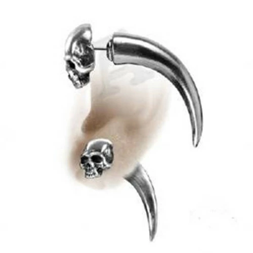 This Alchemy Tomb Skull Faux Stretcher Earring is a polished pewter, silver post ear stud for regular pierced ears, with special and thoroughly convincing backs appearing exactly like a stretched ear.