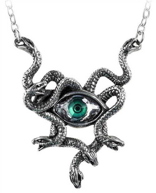 The pewter necklace of a tangle of writhing snakes centred around a Swarovski faceted crystal eye with emerald green iris